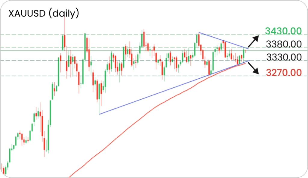 Gold navigates sideways, forming a symmetrical triangle pattern. The price is sandwiched between the 3380 resistance and the 3330 support, so we can we can consider the following possibilities:
