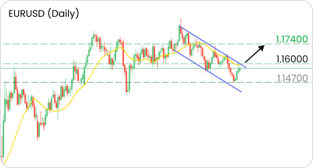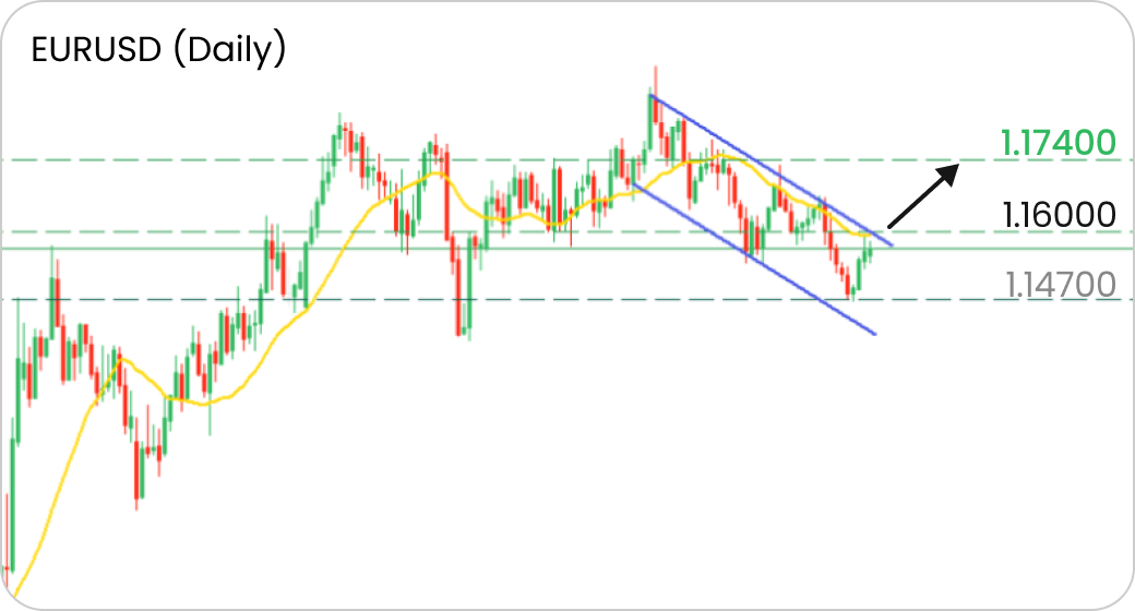 Consider buying EURUSD on a breakout above 1.1600, targeting 1.1740.