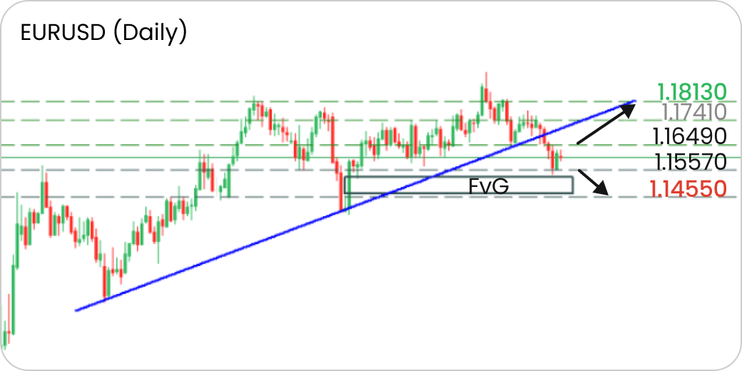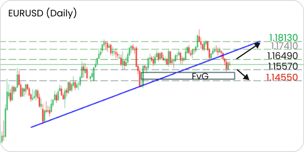 If the support level at 1.1557 fails, the decline may continue toward 1.1455, aiming to fill the FvG gap.