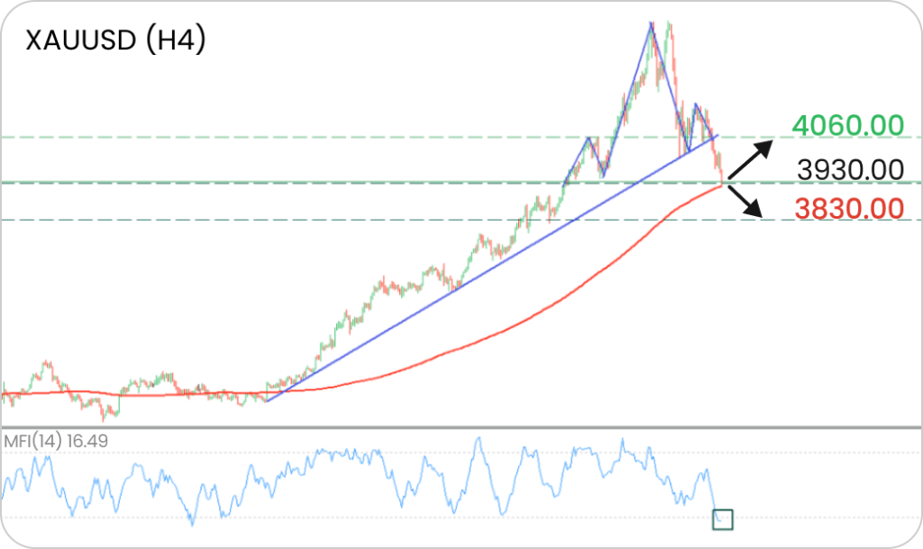 XAUUSD broke below the trend line and the head-and-shoulders pattern, testing support at 3930. The 200-MA offers additional support, while the MFI indicates overbought conditions.