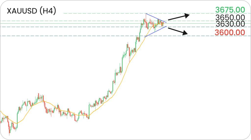 XAUUSD navigates within a symmetrical triangle, sandwiched between 3650 resistance and 3630 support.