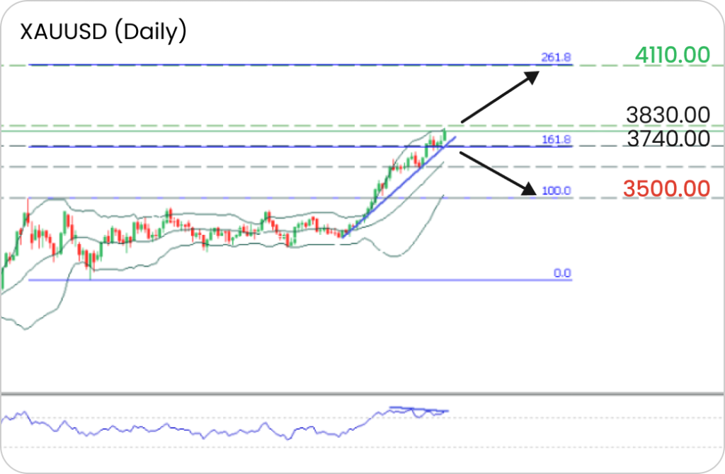 Further upside above 3830 could clear the path to 4110, aligning with the 261.8% Fibonacci extension.