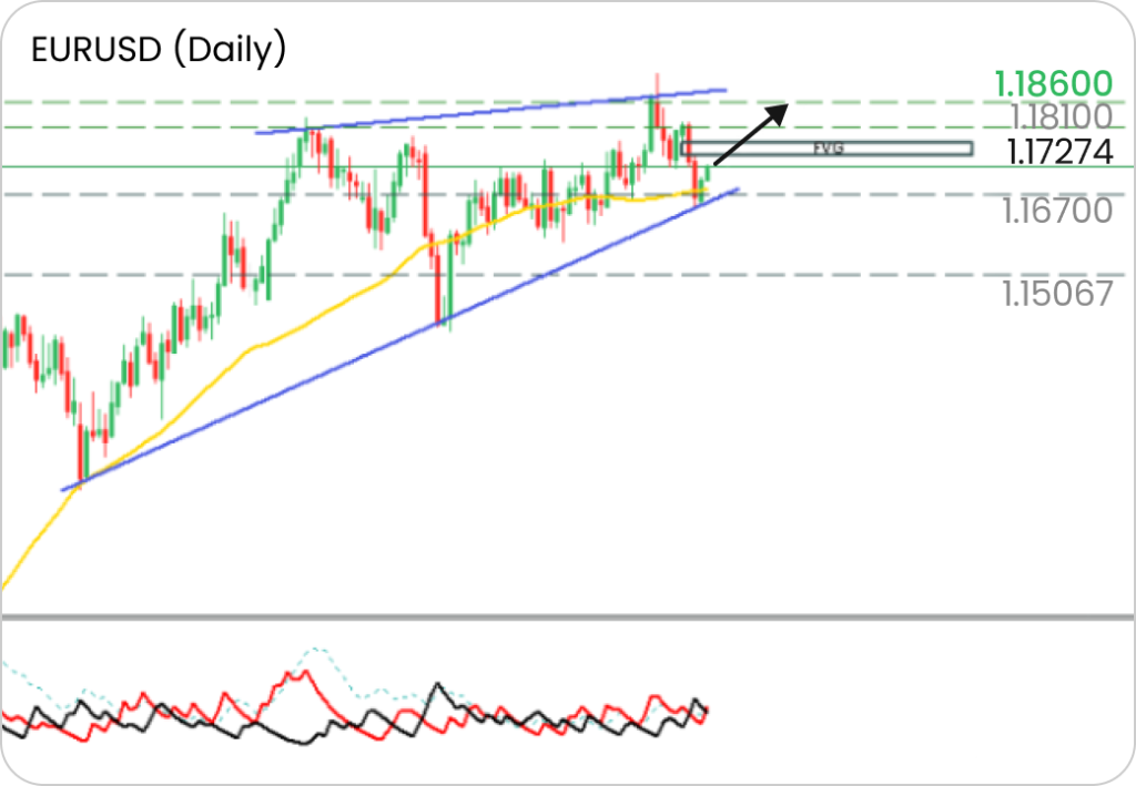 EURUSD has formed a rising wedge and bounced off the lower trend line and the MA50. +DI remains above -DI, with an imbalance visible at the top.